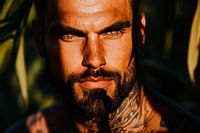 Intense ogen die verhalen vertellen en een indrukwekkend tatoeagespel geven deze look diepte en karakter. Het zachte lichtspel op de bronzen huid benadrukt een magnetische aanwezigheid. Perfect voor een moderne woonkamer of een stijlvol thuiskantoor waar inspiratie en creativiteit kunnen floreren.