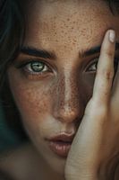Dit prachtige portret toont de fascinerende schoonheid en intensiteit van de blik van een vrouw. De extreme close-up benadrukt de helderblauwe ogen, sproeten en sensuele lippen, terwijl de handen het gezicht zachtjes omlijsten. De zachte, natuurlijke kleuren en rijke details creëren een intiem en expressief kunstwerk. Dit schilderij is…