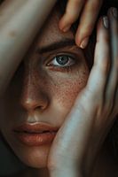Dit prachtige portret toont de fascinerende schoonheid en intensiteit van de blik van een vrouw. De extreme close-up benadrukt de helderblauwe ogen, sproeten en sensuele lippen, terwijl de handen het gezicht zachtjes omlijsten. De zachte, natuurlijke kleuren en rijke details creëren een intiem en expressief kunstwerk. Dit schilderij is…