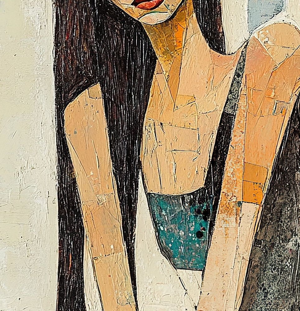Intensity in the Eyes - Dit vrouwen schilderij toont een lange, slanke vrouw met een intense blik en donkere haren, zittend tegen een achtergrond van geometrische, veelkleurige blokken in een collage-stijl.