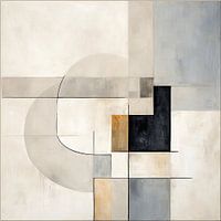 Interieur Geometrische - Dit schilderij kenmerkt zich door een samenspel van geometrische vormen in een subtiele balans van beige, crème, en grijze tonen, aangevuld met een vleugje goud en diepzwart. Het abstracte werk heeft zowel minimalistische als rustgevende kwaliteiten waarbij de overlappende vlakken en lijnwerk een zekere diepte…