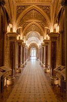 Het prachtige Paleis van Monserrate ligt op een groot landgoed met indrukwekkende tuinen. Het gebouw zelf is klein, en is in de 19e eeuw gebouwd in een mengsel van architectonische stijlen. Op mij maakt het vooral een Moorse indruk zoals vele monumentale bouwwerken in het buurland Spanje. We kijken hier door de centrale gallerij in het gebouw.