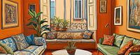 Interieur Planten - Op dit interieur schilderij zie je een sfeervolle kamer met groene en blauwe banken, kleurrijke kussens en grote planten bij de ramen, die een warm gevoel van thuis uitstralen.