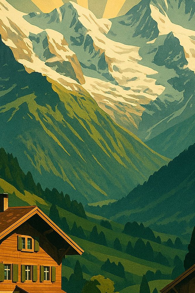 Deze poster in art-decostijl belicht de adembenemende landschappen van Interlaken, een van de beroemdste Alpenbestemmingen van Zwitserland. Omringd door de toppen van de Eiger, Mönch en Jungfrau, wordt Interlaken hier prachtig geïllustreerd met chalets genesteld in weelderige groene valleien onder stralend zonlicht. Het vintage-geïnspireerde ontwerp maakt gebruik van krachtige lijnen, gestileerde arceringen en harmonieuze kleuren om de avontuurlijke geest van de regio vast te leggen. Deze poster is perfect als muurkunst en brengt de energie van de Zwitserse Alpen in je huis, waardoor hij ideaal is voor natuurliefhebbers, wandelaars en reisfanaten. Hij past prachtig in woonkamers, slaapkamers of kantoren en voegt een gevoel van reislust en bergsereniteit toe. Of je Interlaken nu hebt bezocht of ervan droomt om de prachtige landschappen te verkennen, deze poster is een stijlvolle herinnering aan de schoonheid van de Alpen. Het is ook een geweldig cadeau voor verzamelaars van retro reisposters of iedereen die geïnspireerd is door de tijdloze Zwitserse charme van de bergen.