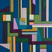 Dit is een krachtig, geometrisch abstract werk waarin structuur en gelaagdheid centraal staan. Het bestaat uit een netwerk van rechthoeken, balken en hoekige vormen die in elkaar grijpen als een architectonische constructie.