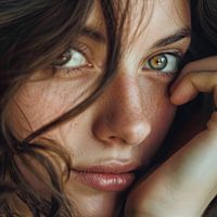 Dit gevoelige portret van een vrouw legt een rustig, bedachtzaam moment vast. De close-up details van haar sproeten, zachte gelaatstrekken en intense blik creëren een band met de kijker. Perfect voor liefhebbers van natuurlijke en emotionele fotografie die de diepte en authenticiteit van een moment waarderen.