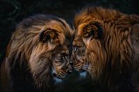 Dit prachtige ontwerp toont twee majestueuze leeuwen die elkaar recht in de ogen kijken, een krachtige uitdrukking van kracht en intimiteit. De gedetailleerde weergave van hun dikke manen en intense blikken wordt versterkt door het gebruik van contrasterende kleuren, wat zorgt voor een dramatisch en intrigerend beeld. Perfect voor elke liefhebber van wilde dieren, voegt deze afbeelding een vleugje wilde natuur en majestueuze schoonheid toe aan uw interieur. Het ontwerp is ideaal voor een moderne of klassieke inrichting en zal zeker een blikvanger zijn in elke ruimte waar het wordt tentoongesteld.