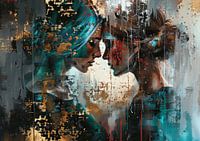 Intimate Portraits Clash - Dit vrouwen schilderij toont een indringende en emotionele ontmoeting tussen twee vrouwelijke figuren, waarbij hun gezichten dicht bij elkaar en bijna tegen elkaar aan geplaatst zijn. De kunstenaar heeft een bijzondere digitale techniek gebruikt die de afbeelding een dynamisch en bijna driedimensionaal effect geeft. De texturen op het doek zijn rijk en gecompliceerd, met laagjes van druipende en spat-achtige verfeffecten, en details in schitterend goud. De kleuren op het doek variëren van diepzwart en grijstinten tot sprankelend aquablauw en goud. Dit is niet zomaar een portret, maar een expressieve weergave van menselijke emotie, elegantie en de complexiteit van relaties, vastgelegd in een unieke stijl die neigt naar een mix van modern, digitaal expressionisme en een vleugje abstract.