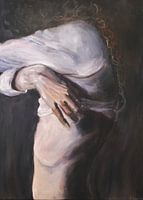 Een jong vrouw ontkleed zich in een donker omgeving. Mooi hedendaags schilderij op canvas die zou passen in veel interieurs. Tijdloos en toch heel modern kunstwerk.