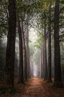 Een magische ochtend in een mistig bos.