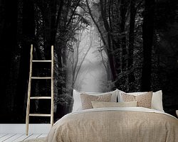 Een prachtig beeld, gemaakt in het bos op een mistige ochtend.