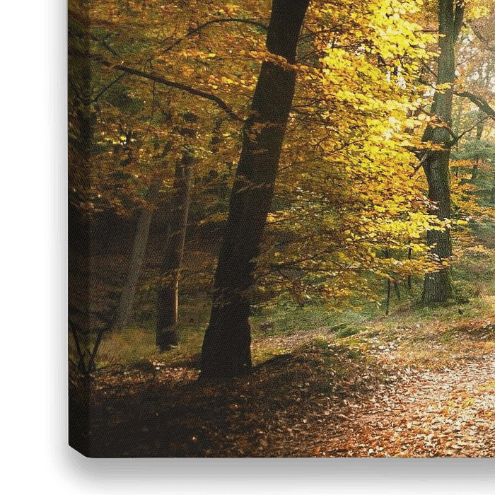 Herfst in het bos, het gele bladerdek van de bomen dat door een laagstaande zon met tegenlicht beschenen wordt. Licht aan het einde van het pad.