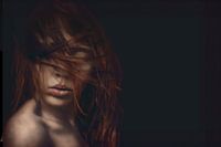 Dit betoverende portret van een roodharige persoon biedt een verfrissende kijk op schoonheid door de focus te verleggen van de ogen naar andere opvallende kenmerken. Het stralende, weelderige rode haar springt direct in het oog en creëert een levendige dynamiek in het beeld. De rijke kleur en textuur van het haar contrasteren prachtig met de achtergrond, waardoor het portret een sterke visuele impact heeft.