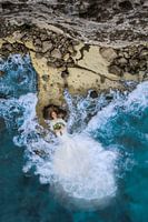 Deze fascinerende beeldbewerking toont een vrouw die op de rand van een eiland ligt, met de zee woest om haar heen. Het is niet duidelijk of ze aangespoeld is of gewoon ligt te genieten van de oceaan. De afbeelding creëert een intrigerend en mysterieus tafereel, waarbij de chaos van de zee contrasteert met de serene rust van de vrouw.