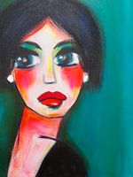 Dit portret van Minou nodigt je uit om je eigen kracht te omarmen. Het is een dagelijkse herinnering aan de strijdster in ons allemaal. De turquoise achtergrond, een kleur die staat voor kalmte en helderheid, vormt een prachtig contrast en benadrukt haar krachtige aanwezigheid van Minou.