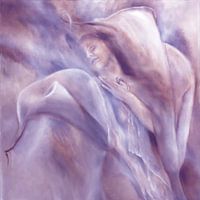 Omgeven door licht, komt een licht figuur tevoorschijn uit de achtergrond. In zachte warme tinten, gedeeltelijk bedekt door abstracte vormen en door het licht. Een droom episode, roze, violet en aards. De figuur gaat een verbinding aan met grote bloesems, met callas, de vormen vloeien in elkaar over.