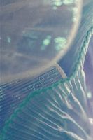 Dit abstracte werk toont een close-up van een delicate, doorschijnende stof met een iriserend oppervlak. Het kleurenschema varieert tussen lichtblauw en groenachtige accenten die veranderen afhankelijk van de lichtinval. De plooien en lichte samenvloeiingen van het materiaal creëren een visuele diepte die nog benadrukt wordt door het lichtspel. De compositie heeft geen figuratieve elementen en concentreert zich op het effect van kleur, structuur en licht.