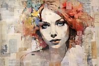 Iris Portret - abstract schilderij / mixed media kunst geschilderd. Mooi contrast tussen het verfijnde portret en rauwe collage/schildertechniek.