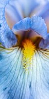 De foto toont een close-up van een irisbloem met intens blauwe bloemblaadjes. Centraal in de compositie staat de karakteristieke gele "baard" van de iris, die duidelijk afsteekt tegen het koele blauw van de bloemen. De fijne texturen en patronen op de bloemblaadjes geven de bloem een bijna grafische kwaliteit, die nog wordt benadrukt…