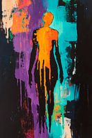 In levendige kleuren maakt het diepzwarte silhouetmotief plaats voor een fascinerend samenspel van oranje, blauw en violet. Deze dynamische compositie straalt een gevoel van beweging en levendigheid uit, ideaal om een opvallend element in de woonkamer te creëren. De uitstraling van de figuur vangt de energie van de kamer en nodigt uit tot reflectie.