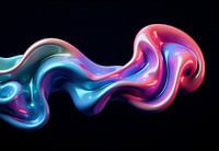 Abstracte afbeelding van een vloeiende, gebogen, glanzende vorm met een kleurverloop van blauwe, roze en paarse kleuren tegen een zwarte achtergrond.