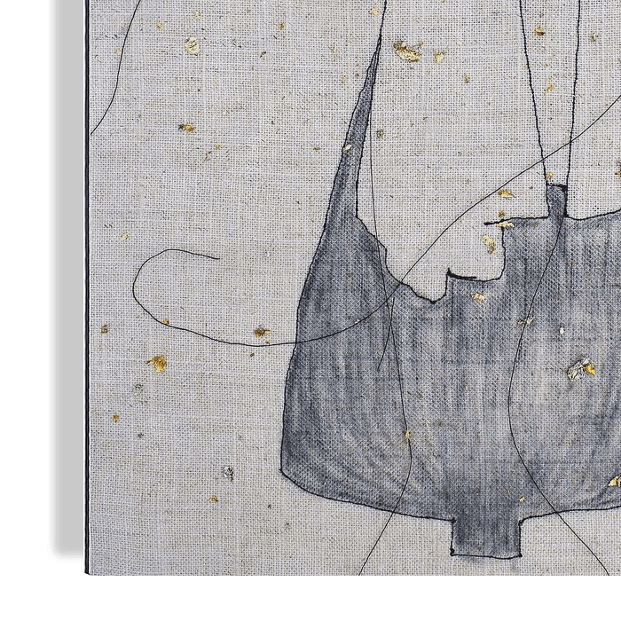 Een figuratief werk van zwart draad ,goud & houtskool op linnen.