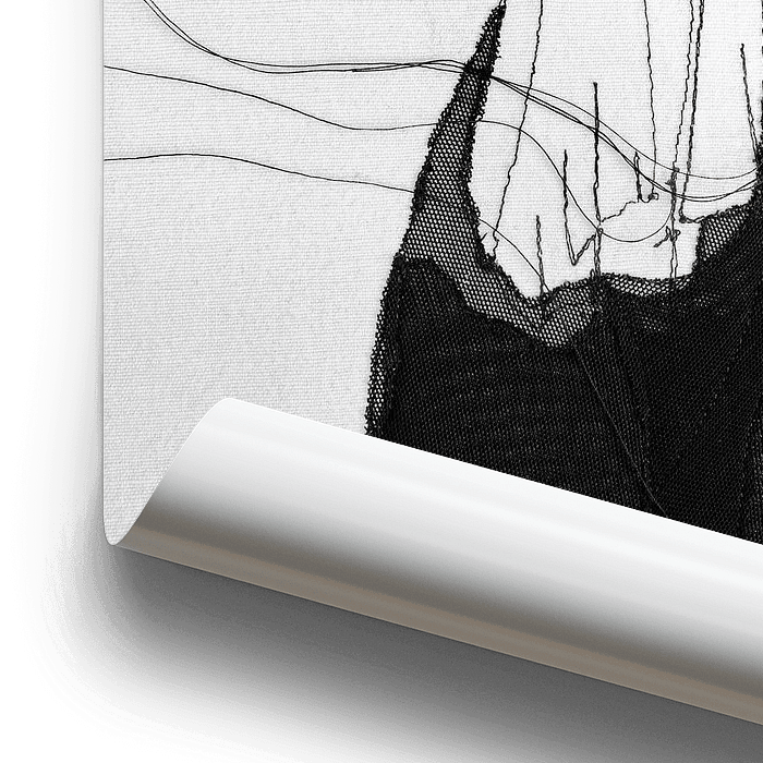 'Irrevocable', een figuratief werk van zwart draad en zwarte tule op wit doek. De beweging van de losse zwarte draden staan in contrast met het onweerlegbare zwarte vlak aan de benen.