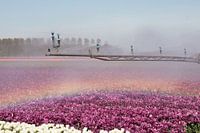 Irrigatie van een tulpenveld creeert een regenboog tijdens droogte