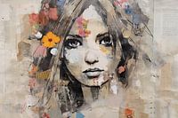 Isabella Portret - abstract schilderij / mixed media kunst geschilderd. Mooi contrast tussen het verfijnde portret en rauwe collage/schildertechniek.