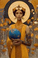 Het schilderij toont een waardige vrouw, gehuld in gouden en blauwe ornamenten en met in haar handen een hemelsblauwe bol met sterrenkaartmotieven. Haar gezicht is kalm en subliem, omgeven door een gloeiende gouden stralenkrans die haar doet lijken op een goddelijke of kosmische figuur. De achtergrond is rijkelijk versierd met florale…