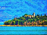 Fotokunstwerk met Isola Maggiore, een van de drie eilanden in het Lago Trasimeno (Trasimeense Meer) in Umbrië, Italië. Het is het enige bewoonde eiland met een stadje van minder dan 20 inwoners. Het eiland is bereikbaar per veerboot. Er is een kapel die de landing van Franciscus van Assisi op het eiland herdenkt. Er is ook een kantmuseum en de plaatselijke vrouwen zitten voor de deur kant te maken. Het heeft ook een kasteelachtig bouwwerk dat het Giuglielmi kasteel (ook bekend als het Isabella kasteel) heet en dat is gebouwd bovenop een bestaand Franciscaner klooster.