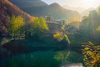 Middeleeuws dorp Isola Santa, meer en bergen van Alpi Apuane in herfsttooi. Garfagnana, regio Toscane, Italië, Europa