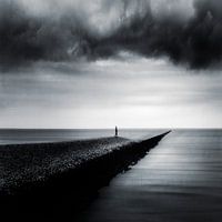 Abstract landschap met een man op een dam op een stormachtige dag.