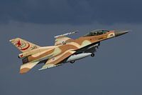 Een Israelische F-16C stijgt op tijdens oefening Iniochos 2018.