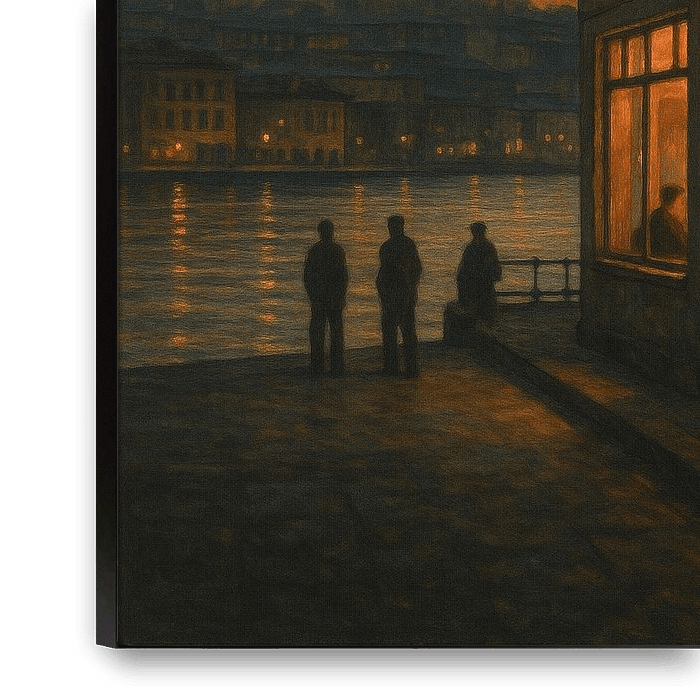 Dit zeer sfeervolle en emotionele schilderij legt een rustig moment vast aan de waterkant van Karaköy. Op de voorgrond gloeit een kleine, met glas afgesloten wachtkamer of café op met een warm, amberkleurig licht, waardoor silhouetten van figuren zichtbaar worden die binnen zitten. Buiten, op de donkere stenen pier, staan drie eenzame…
