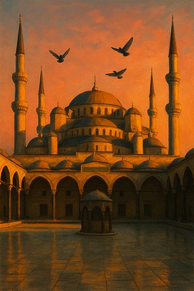 Dit adembenemende en spirituele kunstwerk neemt de kijker mee naar de binnenplaats van de Blauwe Moskee (Sultan Ahmed Moskee) of misschien de Süleymaniye Moskee in de schemering. De scène wordt gedomineerd door de enorme centrale koepel en de hoge minaretten, die allemaal baden in een diepe, vurige oranje gloed van de ondergaande zon.…