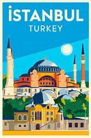 Het majestueuze silhouet van Istanbul rijst op tegen een helderblauwe hemel. De iconische Hagia Sophia, met zijn indrukwekkende koepel en elegante minaretten, vertelt over vroegere pracht en cultureel erfgoed. Op de voorgrond mengt de traditionele architectuur zich harmonieus met de groene heuvels en de levendige flair van de stad. Een waar feest voor de zintuigen!