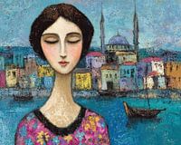 Istanbul schilderij | Dromerige Blik op de Bosporus - Op dit schilderij zie je een vrouw met een bijzondere uitstraling, voor een kleurrijke achtergrond van huizen en de beroemde gebouwen van de stad Istanbul, met een heldere blauwe lucht en een kalme zee.