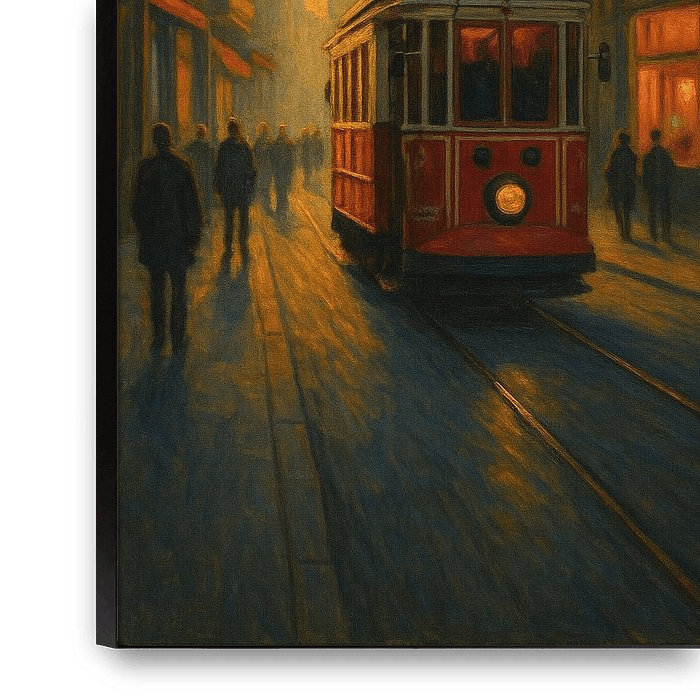 Dit levendige en nostalgische schilderij vangt de energie van Istiklal Avenue (Istiklal Caddesi) in de wijk Beyoğlu. Het middelpunt is de iconische rode nostalgische tram, waarvan de koplampen door de blauwe schemering schijnen terwijl hij over de rails rijdt. De straat is omzoomd met hoge, historische gebouwen in Europese stijl,…