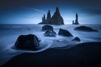 Sfeervolle groothoekopname van de rotsformatie Reynisdrangar in IJsland bij schemerlicht. Lange sluitertijd met terugtrekkend water in het blauwe uurtje op het gitzwarte strand.