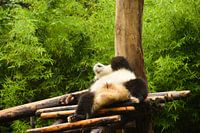 Deze luie pandabeer had weer genoeg gedaan voor vandaag. Deze mooie beer is omringd door al het groene bamboo die hij zich maar kan wensen.