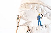 Door gebruik te maken van modelbouwfiguren kun je vaak een heel andere wereld creeeren en ontsaat er een vervreemdend beeld. In dit geval van mannen die een gipsen gebit schoonmaken of onderhouden