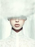Modern portret van een vrouw in een kanten top, volledig in het wit. Haar gezicht wordt aan het oog onttrokken door een witte wolk, wat het werk een tikkeltje mysterieus maakt. Modern chic.