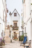 Dompel jezelf onder in de betoverende schoonheid van Zuid-Italië met een blik op dit pittoreske hofje in Locorotondo, vereeuwigd op deze foto. In deze charmante opname vang je een nauwe steeg, omringd door stralend witte huizen, waarin de essentie van de Italiaanse levensstijl tot leven komt.