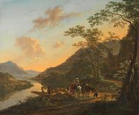 Herders en een elegant paar nemen een pontje. Ze moeten wel, want de stenen brug is afgebroken. De dame op de schimmel wijst ernaar in de verte. Met het veer voegde Both een verhalend element toe aan zijn landschap. Hij laat de scène in het gouden avondlicht baden, en legt over de dalen een blauwachtige waas.