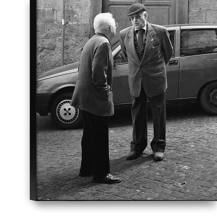 Italiaans straattafereel waarbij twee oude Italiaanse mannen op straat praten met op de achtergrond een oude fiat panda in zwart-wit. Dit werk maakt deel uit van de 'La Dolce Vita collectie'.