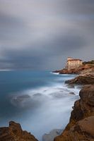 Aan de Italiaanse kust tijdens een onweersbui op Tyrreense Zee. Door de lange sluitertijd is het kolkende water over de rotsen als een zijde zachte deken.