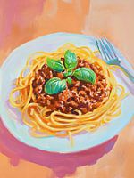 Italiaanse Pasta met Basilicum - Dit culinaire schilderij toont een smakelijk bord spaghetti bolognese, rijkelijk bedekt met saus en versierd met frisse blaadjes basilicum, gepresenteerd op een zacht pastelkleurige achtergrond.