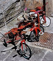 Drie rode, Italiaanse speelgoed driewielers te koop, allemaal op een rij voor een antiekwinkel in Cortona, Toscane. Heerlijk nostalgisch, herinneringen aan de kindertijd.