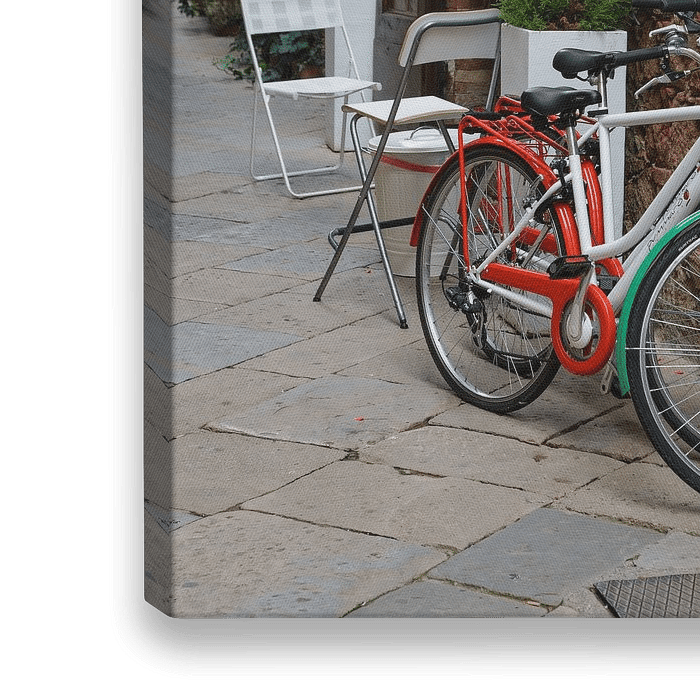 Twee fietsen in de kleuren van de Italiaanse vlaag voor een pizzeria in Pienza in Toscane, Italië.